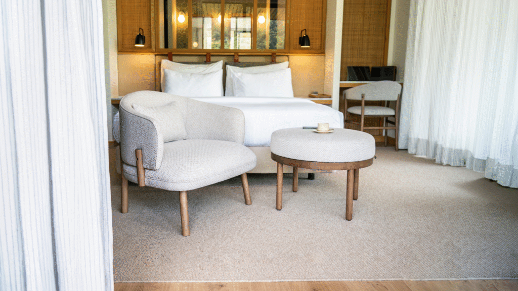 When selecting Lounge Chairs and Footrests for a contemporary minimalist space, the dialogue between pieces is key. The Goa Lounge Chair, designed by Francesc Rifé, conveys a sense of grounded lightness. Its beauty lies in the exposure of the skeleton; the solid ash wood frame is not hidden but celebrated, framing the upholstered seat with architectural precision. Its low profile speaks to a “quiet luxury” aesthetic, where the quality of the joinery takes center stage.