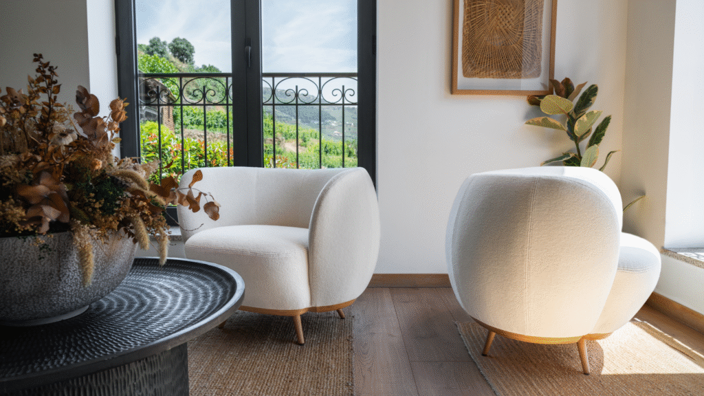 Moving into the realm of sculptural expression, the Pipo Lounge Chair stands as a tribute to Portuguese heritage, specifically the wine culture of the Douro region. Its name and shape draw inspiration from traditional wooden barrels (“pipas”). The design is monolithic and enveloping, crafted from solid wood that has been masterfully carved to create a seamless, curved surface. It is a piece that demands to be touched, showcasing the raw beauty of timber in a form that feels almost like a living organism wrapping around the user.