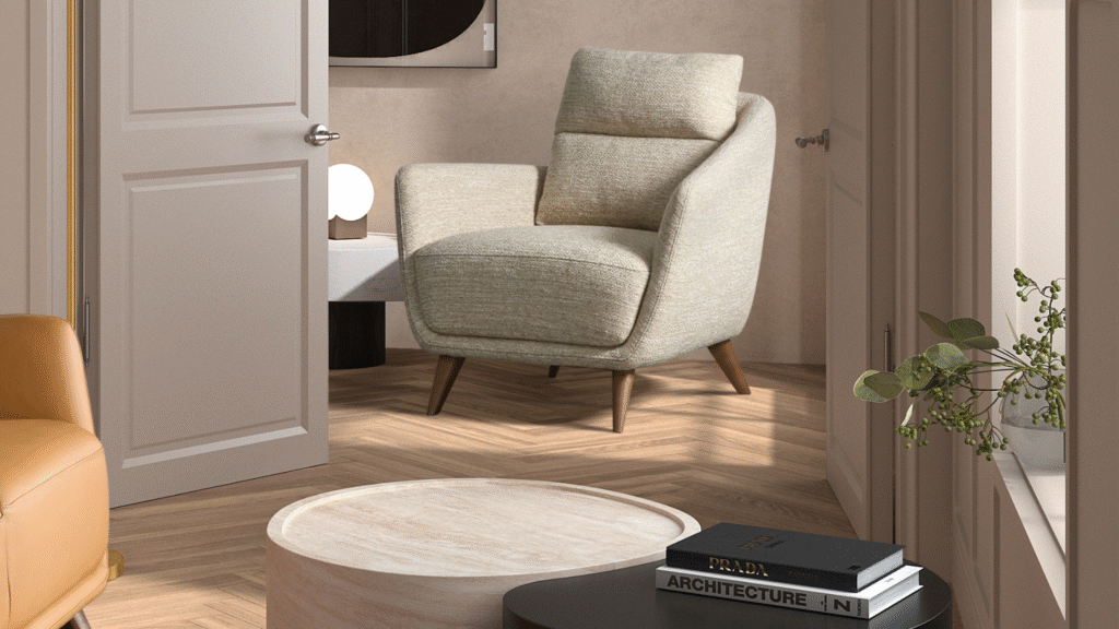 Finally, for interiors that require a touch of theatricality and fashion, the Scala Lounge Chair offers architectural grandeur. Its design is characterized by its generous volumes and the distinct vertical detailing on the backrest, reminiscent of the pleats in haute couture or the columns of classical architecture. The Scala is a statement piece that anchors a room, offering a deep, plush comfort that invites long periods of relaxation, making it the ideal centerpiece for a luxury living room or a sophisticated hotel lobby.