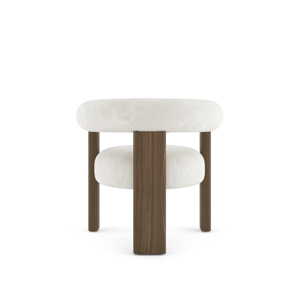 Inspired by the contrast between Nordic architecture and the gentleness of domestic life, it brings together the firmness of solid wood and the quiet embrace of generous upholstery. The result is a chair that feels both composed and deeply welcoming—precise in line, yet warm in spirit. Its silhouette carries a kind of silent confidence. The wood speaks of craftsmanship and permanence; the upholstered volumes introduce comfort with grace, never excess. Every proportion is deliberate, designed to create a presence that calms the room rather than competes with it.