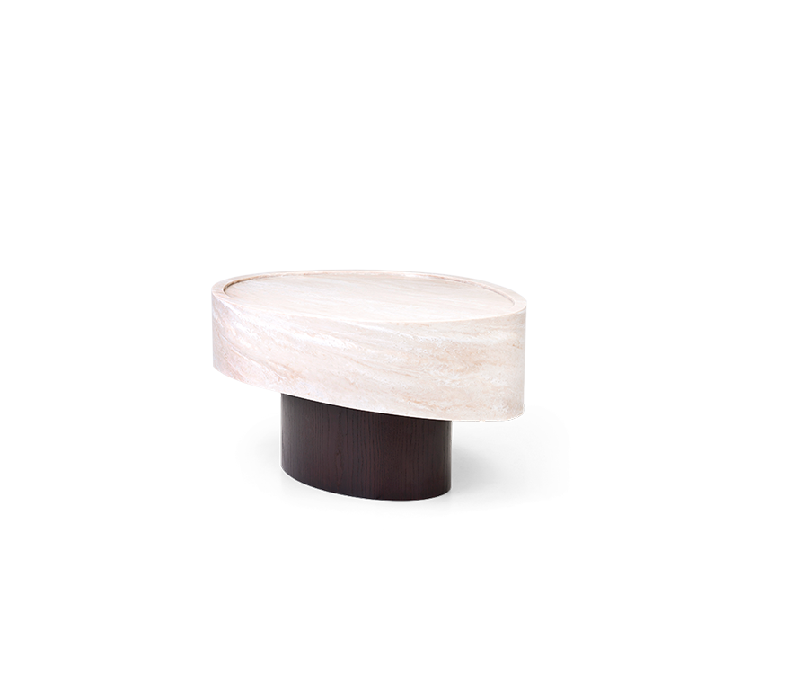 With its bold and sculptured base, enriched by the precious materials chosen for this piece, Lynn Side Table, designed by Aitor Garcia de Vicuña, is inspired by nature, specifically in the mountain caves where the geometric entrances seem constructed by humans.