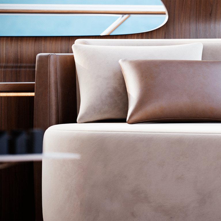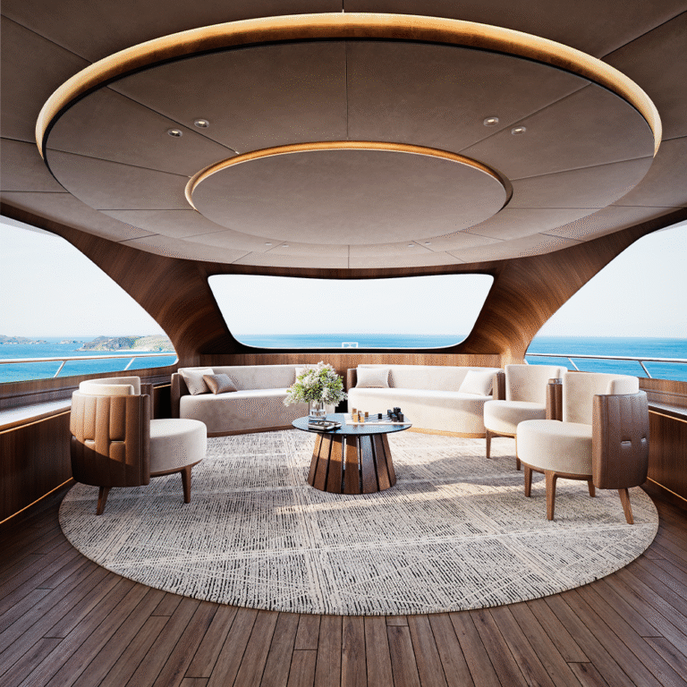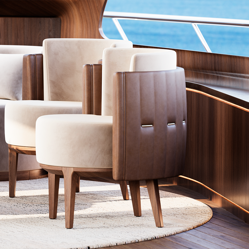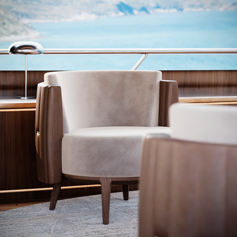 Look closer. Arms taper like the sweep of a hull. The cushions hold you without sinking, a calibrated embrace for sunrise coffee or midnight charts. Stitching traces a deliberate line—subtle, almost nautical—while edges are softened to the touch, never sharp, never brittle. At a glance, the palette reads as effortless sophistication; in the hand, it’s performance: quick-dry foams, UV-stable textiles, refined wood and brass metal accents. This is luxury yacht furniture crafted in Portugal and tuned to the horizon, where every voyage becomes an atmosphere and every berth a salon.