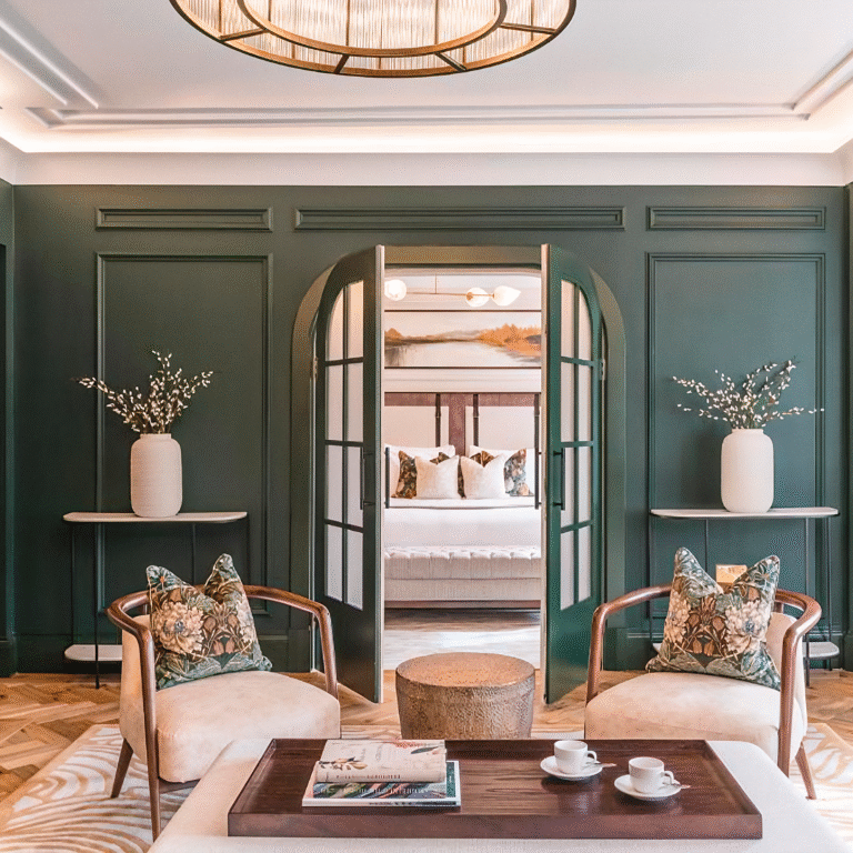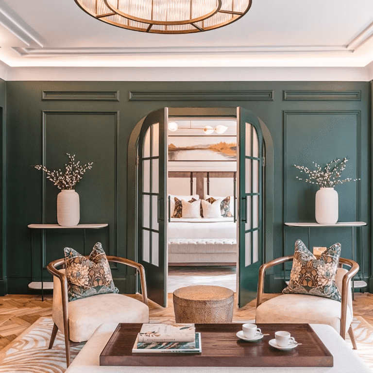 Within this tranquil setting, the Essex Armchair introduces a sophisticated contrast with its cosmopolitan character. Handcrafted in ash wood, finished in brown pewter, and upholstered in cotton velvet, the piece combines comfort and contemporary design, seamlessly enhancing the hotel’s refined interiors.