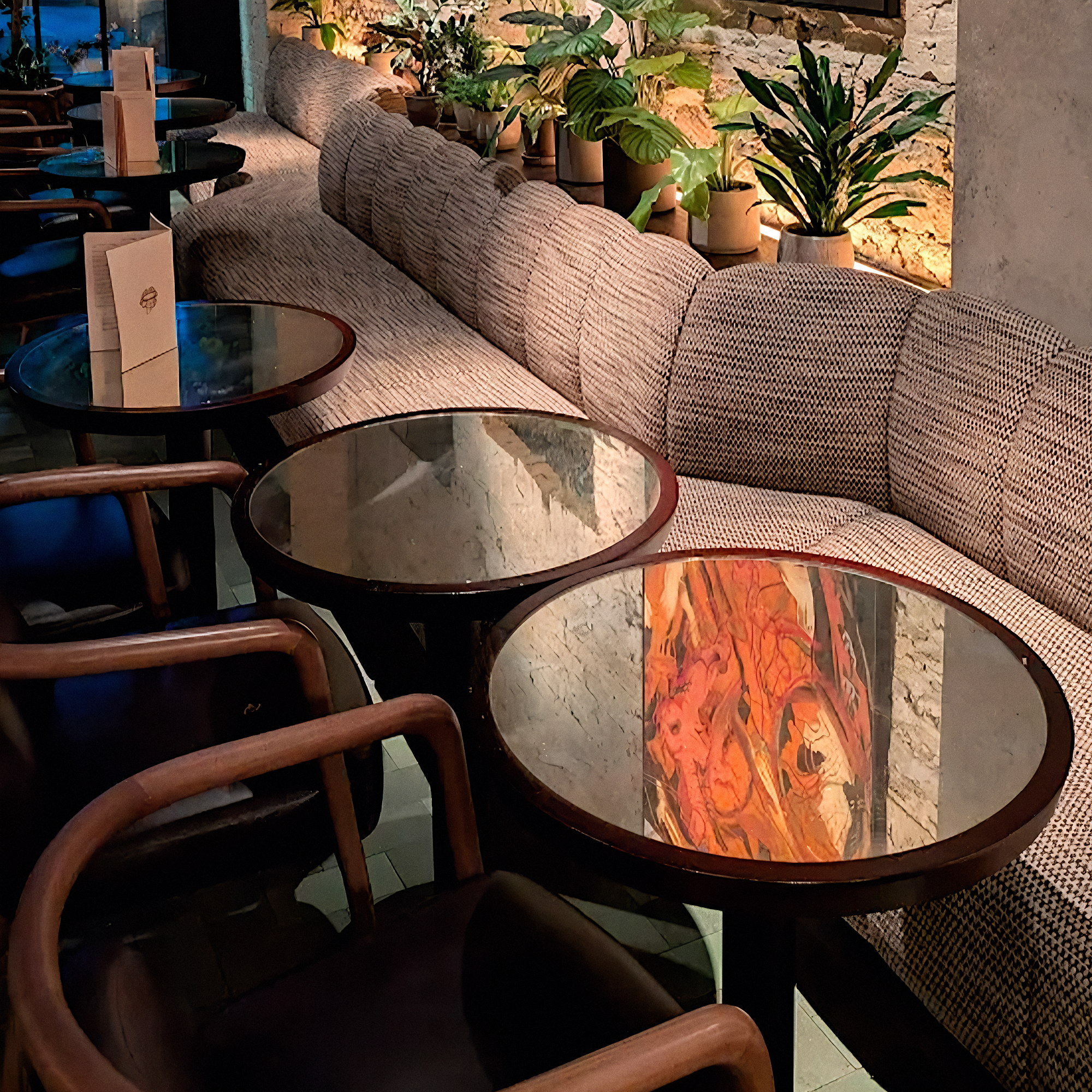 Complementing this vibrant atmosphere, the Essex Armchair introduces a refined, cosmopolitan touch. Handcrafted in ash wood, finished in brown pewter, and upholstered in cotton velvet, it blends contemporary design with comfort, elevating the restaurant’s warm and sophisticated interior.